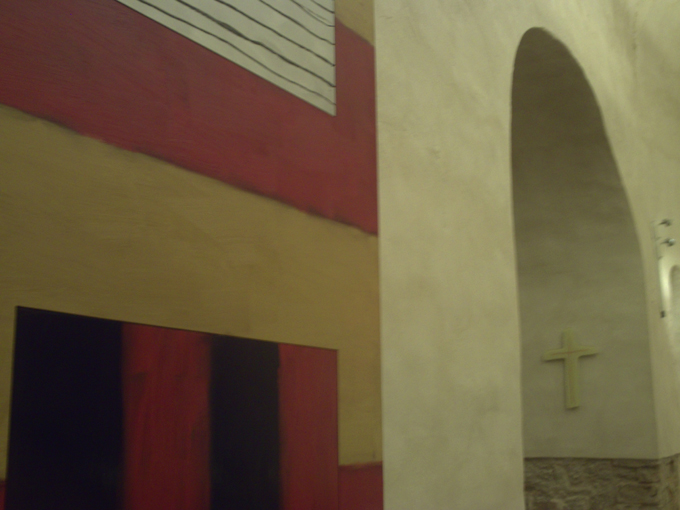 Els grisos, de lligam rothkonià, prenen la paraula a la peça que rep al visitant. Una peça gran. Scully treballa cercant ritmes cromàtics, oposats amb ritmes geomètrics i repeticions. Sobretot fa faixes. I pinta colors plans directament sobre la superfície o a sobre de tons contraris de base, cercant l’expressió a través de la transparència, els límits entre tons, el ritme concret de la pinzellada. Als peus de la nau hi ha dues pintures dedicades a Santa Cecília, a les que evocaria a través de la personificació del vermell amb la Santa. També ha introduït retallar la superfície per introduir com un pegat, amb un motiu discordant. En la pintura de la dreta, un retall de fons blanc, creuat de línies negres, evoca un pentagrama –Santa Cecilia, patrona de la música o personificació de la dona que s’expressa a través de l’art musical-.