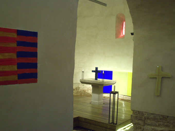 Amb tot crec que és un treball xulo, si bé en termes generals es parla de la intervenció a Santa Cecilia com a pintura mural. Però no em sembla el més adequat: realment, la part de formats més grans, són pintures a l’oli sobre alumini, penjades sobre la paret. Sobre la pròpia paret, només hi ha com uns petits requadres, amb les franges de colors geomètrics pintades sobre un fons preparat. Pintura mural per mi hauria d’haver estat pintura al fresc o seca sobre el mateix mur o amb la tela, adaptada de manera molt més dissimulada, a la superfície parietal (com les grans teles de Riquer o Llimona a la basílica). Però de pintors al fresc, amb estils abstractes purs i de motivacions cristianes, n’hi ha? En qualsevol cas la intervenció de Scully retorna a Santa Cecilia un paper important com a espai per reflexionar sobre la fe a través d’una imatgeria contemporània i que com l’art romànic, podrà ser perenne, mentre hi hagi connexió entre l’obra, el “jo” i el seu significat teològic.