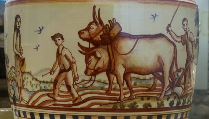 La ceràmica és en Aragay, el que la xilografia en Ricart. De ceràmica a la mostra, no n’hi ha molta, però és suficient per copsar el seu accent per actualitzar la tradició: artista millor format, aplica amb seguretat i de manera sofisticada el dibuix i el color. Les antigues auques ja eren com “contes”, però ell les dota de caràcter més pedagògic i l’argument resulta molt més descriptiu: observem per exemple la narració dels treballs del camp en un magnífic gerro. La marca més especial de l’artista està en els colors dels esmalts: els tons vermells vinosos sobre fons beixos. L’exposició també mostra un altre tipus d’obra amb motius iconogràfics, però treballat amb baix relleu, que és la producció que es correspon a l’etapa de Breda. El fet és que la seva obra va sentar unes bases importants. L’exposició mostra també un vas ceràmic vinculat amb la restauració de la font barcelonina de Santa Anna, que és un obra emblemàtica.
