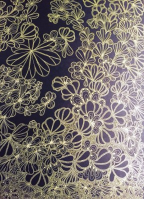La proposta és impressionant: de la mà intuïtiva de Fo, surten una sèrie de filigranes de tarannà orgànic. A vegades semblen pètals o ales de papallones. Però sobretot són línies continues que es generen i generen conjunts d’una gran complexitat i una gran bellesa. Formes que es van repetint i van variant, evolucionant. Fuensanta, quan si posa, no té pressa i acaba cosint entre sí les línies, amb ratlles, com dotant del conjunt d’un major refinament estructural.
