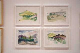 Hi ha algunes aquarel·les que les trobem repetides després en pintures, però no puc dir si són esbossos o que l’artista simplement i tal i com ens diu, ho ha repetit in situ en mitjans diferents. El “dubte” ve de que en les aquarel·les es veu molt bé el treball directa i intuïtiu amb pinzellades amplies, ven carregades de pigment i aigua i amb prou feines insistides. Es veuen bé com a treballs ràpids i resolutius. Fet que dóna un gamma plana que amb els tons oposa nivells i formes del paisatge i introdueix qüestions lumíniques. El mateix exercici fresc i físic d’Ocaña crec que guia les pintures a l’oli de format més gran. I en tots els casos crida l’atenció que són colors càlids, però forts. No són ben bé gammes mironianes, sino verds esmaraldes, liles, sofres, blaus de llum de lluna. Colors que tenen caràcter i és cert que amb això mantenen parantesc amb la pintura de Centelles.
