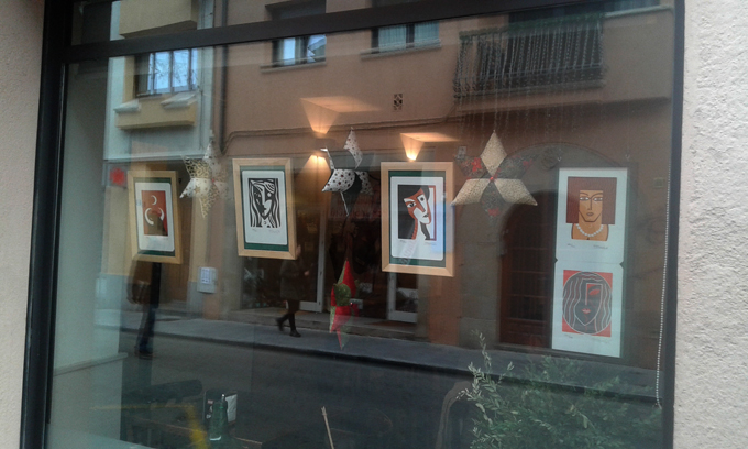 Pascual ha tornat sovint a Centelles: exposició al Marçó, col·laboració a la Col·lectiva Aleix Art i ara ens torna amb aquestes seves Nadales, ben seves i també amb una porció centellenca. Però aquests papers poc tenen a veure amb les estampes tòpiques. Més aviat, l’artista aprofita aquest espai per definir una versió personal de les festes, en base al seus temes artístics. No són imatges de Nadal, però no és ben bé possible desnadalar-les del tot: sempre tenen un punt místic o un encant còsmic. Un referent llatí, clàssic, un aire com etern o universal. En els papers de les Finestres, veiem per exemple, moltes dones. Molts rostres femenins. La dona, bella, tranquil·la, femenina, és constant en l’obra de Pascual. Però en els rostres dels papers, ¿no hi veieu com una àurea espiritual, com de dona mare, protectora dels Homes? Com una reformulació del possible rostre de Maria, “avatar” que d’alguna manera pot recaure en tothom. Maries, Eves, Venus, etc.