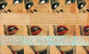Agafem dues peces de l’exposició per exemplificar-ho una mica. La primera peça és un collage plastificat –i em sembla curiós que sigui plastificat perquè potser buscava uns acabats específics- sobre una tela que fa 33×55 cm, és del 1965 i es titula “IBM 360”. A la peça s’hi repeteixen quatre imatges d’una dona jove que mira de reüll i amb la boca oberta com de sorpresa o si es sentís vigilada. Una imatge bastant cinematogràfica. Ulls i boca estan separats per uns fulls de registre que crec devien ser com els que els computadors de l’època imprimien. L’IBM 360 era un ordenador d’aquests grossos com un armari i amb molt botons, que l’empresa americana va vendre entre 1965 i 1978. A la part de baix entre boca i barbeta encara hi ha una franja amb pedretes. A mi em fa l’afecte que l’obra eludeix a la por de l’artista pel paper cada cop més poderós de la informàtica. I encara no s’havia inventat internet.