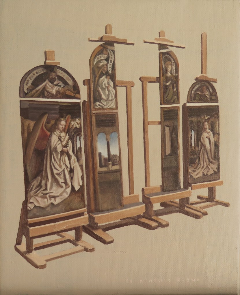 “On dono voltes és al títol” , ens diu. Potser la nostra exposició es tituli “la pintura segueix”, per defensar la praxis artística i perquè és com es deia un petit quadre, fet fa un temps, que és el que podeu veure d’ella. Crec que forma part de la sèrie dedicada a obres de museus, que també es poden veure a la seva web.
