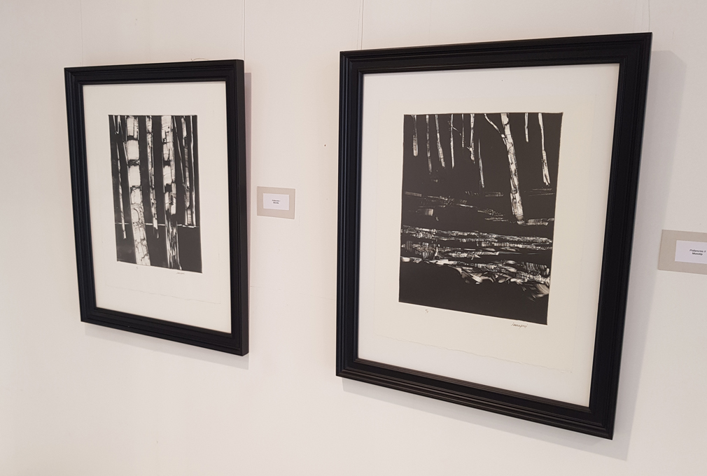 Ambdues exposicions reuneixen obra nova i de la reserva. Ambdues parts es multipliquen els temes dedicats a la naturalesa: paisatges i racons marins o de interior i també fulles, com les del gingo que es multipliquen per gravats i en pintures. Ho podem veure, per exemple a la tela amb que l’artista va ser seleccionada a un Premi Centelles, fa uns anys.