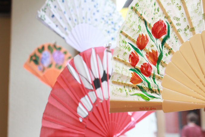 Alguns ventalls van acompanyats per unes bossetes de roba que també han estat decorades. Els ventalls són de colors i estant pintats sobre la part de roba, tots originals, diferents i signats. S’estaran a les Finestres durant el mes de juny.