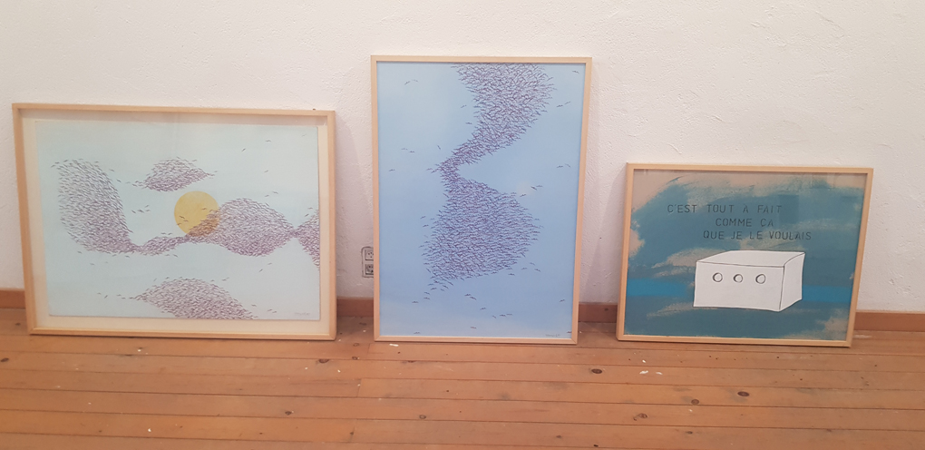 El “camps de batalla” més actiu està en les pintures que hi ha pel voltant. Ens diu que ho ha de reordenar. Però hi ha canvis sovint i ara ho té una mica com pot. Hi ha obra d’aquest 2021 i dels passats. Retrobem les seves “flors”, però ens criden l’atenció uns paisatges dedicats a les danses dels estols d’estornells. Segur que ho pot observar per la seva comarca i l’hi serveixen d’excusa per dibuixar formes de les formes: no hi veieu, per exemple, un gran peix? També construeix atmosferes molt poètiques, oposant la lluna o el blau del cel. I intentar trametre a la cartolina la idea de moviment. Hi ha vàries d’aquestes peces. Pascual empra colors vius, tendeix a esquematitzar les formes i a fer taques planes.