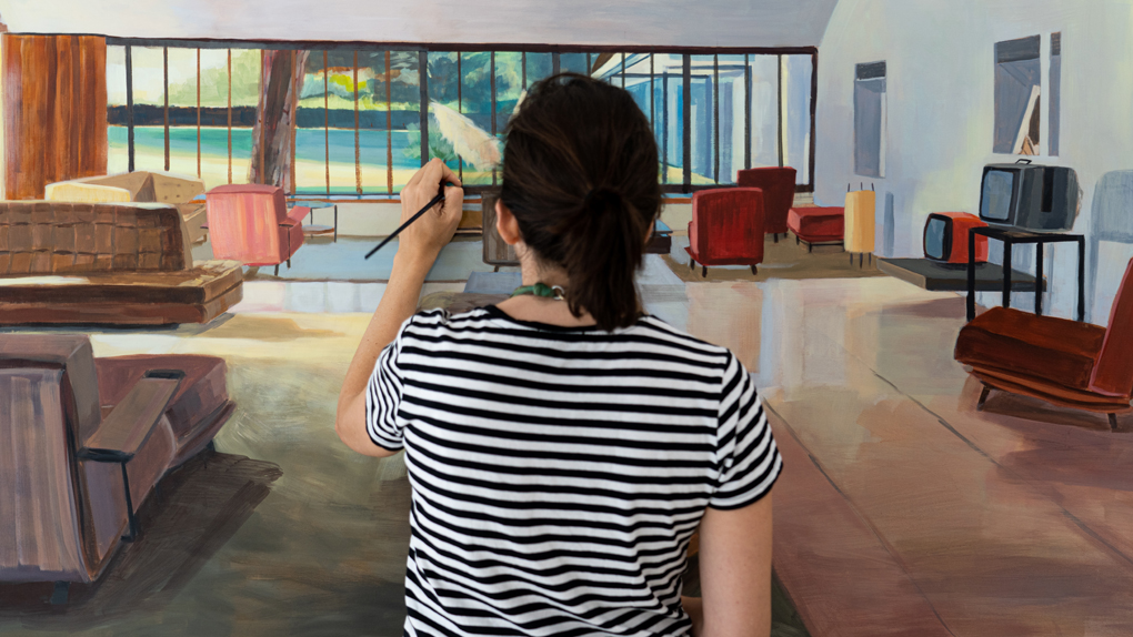 Bea Sarrias, la pintora, ens assegura que fa més de vuit anys que l’espai la té enamorada i per això, des de que ho va descobrir hi ha dedicat diverses sèries pictòriques. Formada a Belles Arts, a Barcelona, Sarrias ha convertit l’arquitectura en el seu tema principal: ens explica que enlloc de retratar persones, ho fa de construccions, atreta per la llum i l’atmosfera sobretot d’edificis d’estil modern i racionalista. Però fa tant obra d’autor com més “anònima”.