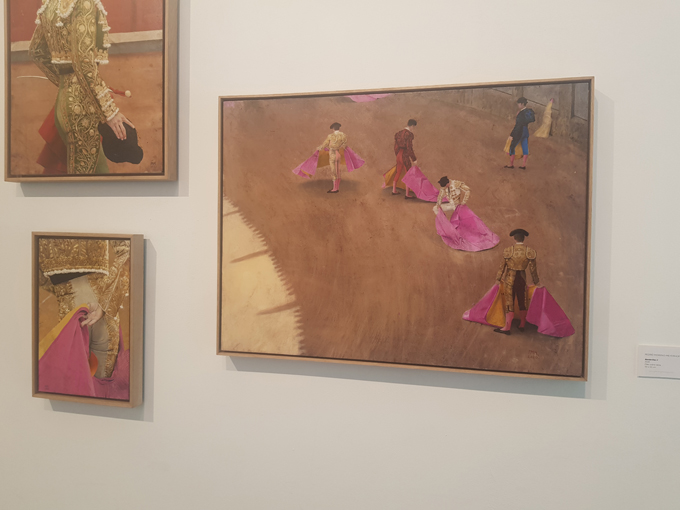 A la Marlborough porta pintures a l’oli sobre fusta i dibuixos. Toca diversos temes, com exteriors amb edificis solitaris, esquelètics o ruïnosos. L’hi agraden les escales. Els terrats urbans. La llum. També toca la natura morta i porta també diverses pintures dedicades al toreig. Aquests em semblen interessants com a temàtica poc freqüent i menys ara quan els toros, a Catalunya, pasturen tranquil·lament pels camps.