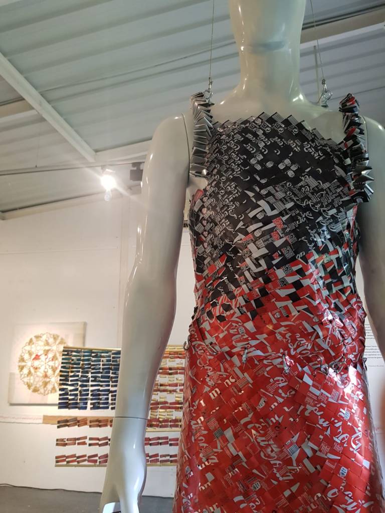Francesca Riu adopta el camí de les arts de la instal·lació escultòrica a través de construir elaboradíssimes peces que recolzen el seu discurs. Per l’antic taller de la Conxa- que queda petit- hi trobem maniquís (masculins) amb vestits fets amb trossos de llauna de refresc (el vermell), banderes americanes fetes amb bales o l’arbre del que broten dòlars. Són escultures poètiques i incisives sobre els mals de la cultura capitalista, que permeten contemplar-les i rodejar-les mentre reflexionem sobre el nostre petit paper en el poder dels mercats.