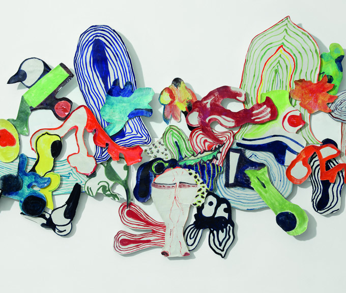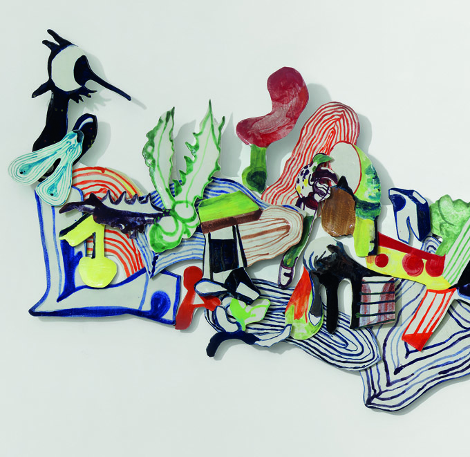 També hi ha peces aïllades, iguals a les del mural, però d’altres dimensions i algunes fetes més recentment, que es presenten soles o fent noves escultures “auto sostenibles”. I també hi ha alguna pintura feta en paral·lel al treball ceràmic.