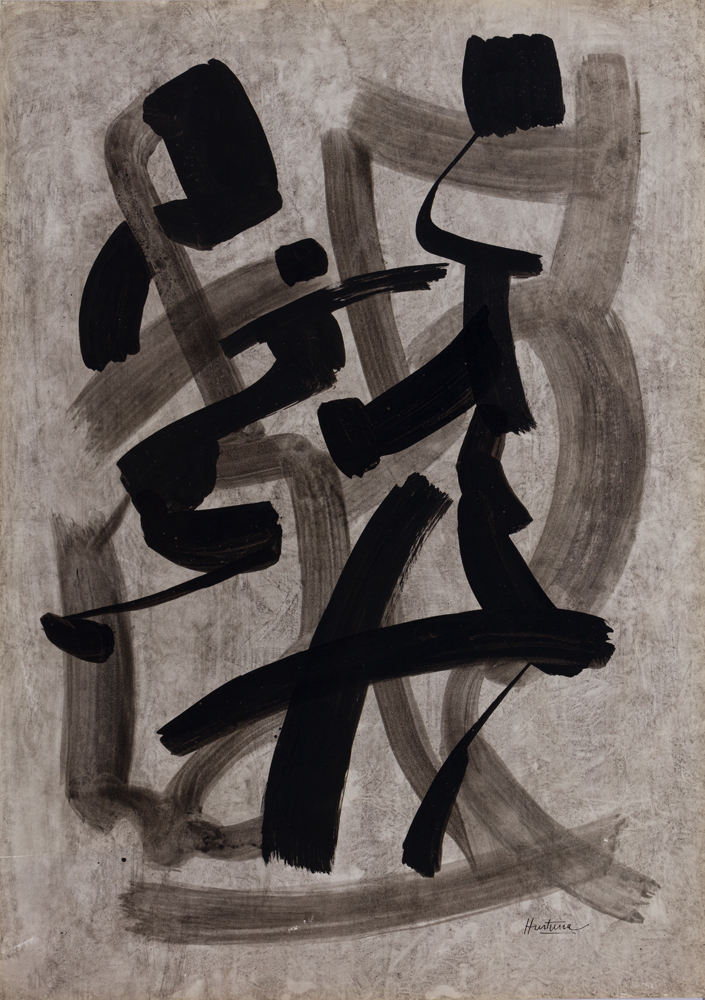 A Hurtuna, sincerament no el coneixia. Però és summament interessant. La mostra recull testimonis dels seus inicis fins a la consolidació del seu llenguatge. Primer, amb una figuració més o menys normaleta, fins que cap als anys seixanta fa un salt cap a un magnètic treball amb tinta negra, que escampa sobre el paper, formant trames o geometries i a vegades hi ha més idea de traç a la manera d’una cal·ligrafia oriental. I sabia la manera de trobar els matisos dels grisos. Més endavant, trobem exemples amb colors amb obres amb oli. I molt més endavant –dintre la saleta amb obra gràfica-, també hi trobem algunes litografíes d’època (anys seixanta). Però crec que la part més interessant, és la del treball amb la tinta negra i el joc simple i poètic amb la línia.
