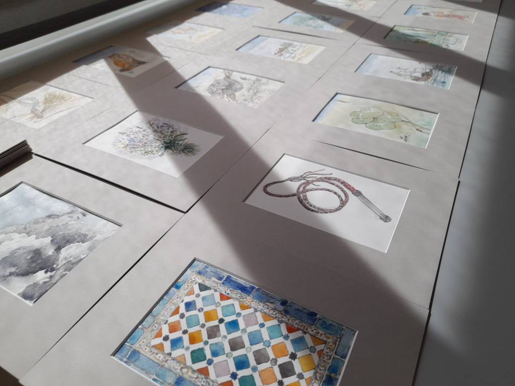 Finalment s’han presentat les cartes de Lenormand. Trobareu més explicacions a la secció Sírius. Aquí només apuntarem que a nivell de dibuix, la proposta ens descobreix una altra Marina, sobretot pel que fa al color. A nivell de traç, pels skethcrawls i també sabent que fa retrat, ja intuíem que fins ara ens havíem centrat en una part del seu univers. I hi ha més. Les cartes són una mostra policromada. Ella mateixa diu que tot ha estat un procés. La Marina havia proposat croquis més austers: línia i alguna taqueta. Però la Lola Clavel –que va encarregar les cartes- volia color. I la Marina ha acabat generant unes cartes que són un tresor que honora l’Alhambra -lloc a què estan dedicades- i a tot el Mediterrani –la terra de tots: color i llum. I expandint-se. La Biblioteca de Centelles disposa d’una baralla.