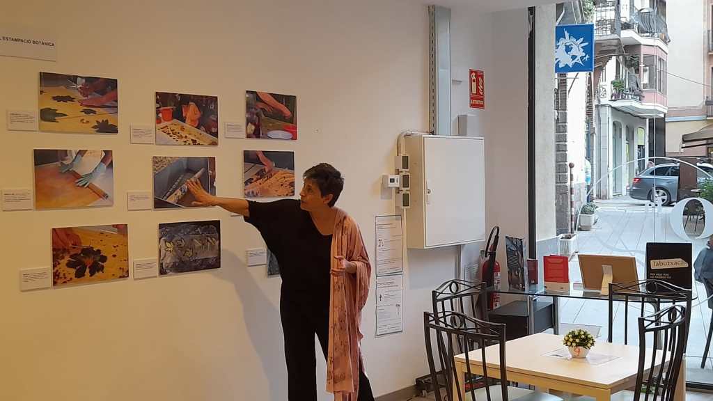 Al Penjador i a El Trabuc ja veuríem bé una exposició del seus teixits estampats. Però la primícia és a Ripoll. Fins el dia 10 d’agost, es pot veure en un establiment, La QP, que acull restauració, una llibreria, oficines per a co-working. És un lloc engegat fa uns mesos, i també fan exposicions. És a un racó de la Plaça Gran, al costat de la modernista Casa Alòs.