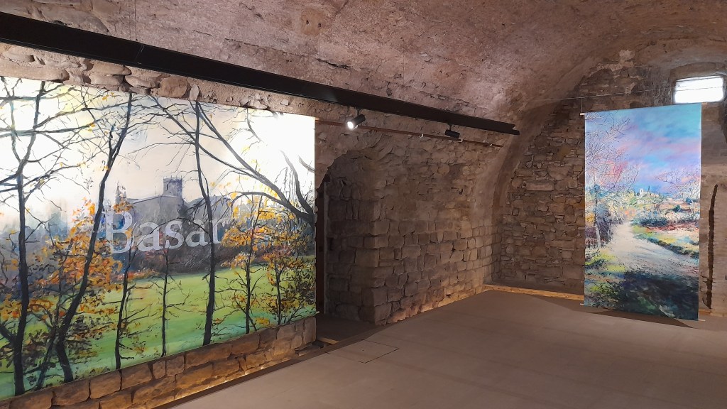 La tela més gran, d’uns vuit metres de llarg, és la de Cabrera: sembla que hagis de caminar per sobre el llom de l’altiplà. Les dimensions ho afavoreixen i les pinzellades resolutives per representar els volums de la muntanya ho fan versemblant. Però és tot pinzellada. Casals no amaga que parteix de grans pinzellades i posant negre i la resta de colors, de forma intuïtiva, va alçant volums i detallant boscos, plantes, les arquitectures, el cel i marcant les distàncies. Casals pinta amb acrílic i diria que es limita la paleta -verd, negre, magenta, groc i blanc- per arriba a tots els matisos possibles. Les pintures descriuen els espais i també l’atmosfera de llum, amb tons rosats o detalls ben particulars de les estacions comarcals. Es podrà visitar fins l’11 de desembre. L’Albergueria és al carrer de darrera de la catedral de Vic.