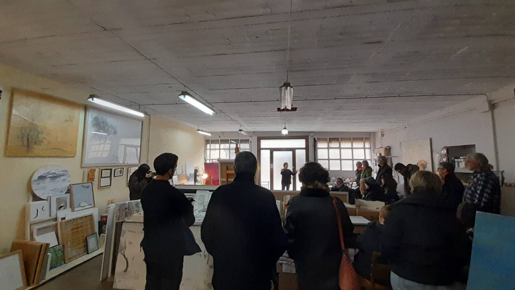 Mentre, la pintora Marina Berdalet ja era al seu taller. L’Estany es pot recórrer tot a peu: del monestir al taller, quatre passes. Per fomentar els artistes, s’havia programat una visita al seu taller, uns “estudis oberts” amb comentari i demostració, en viu.
