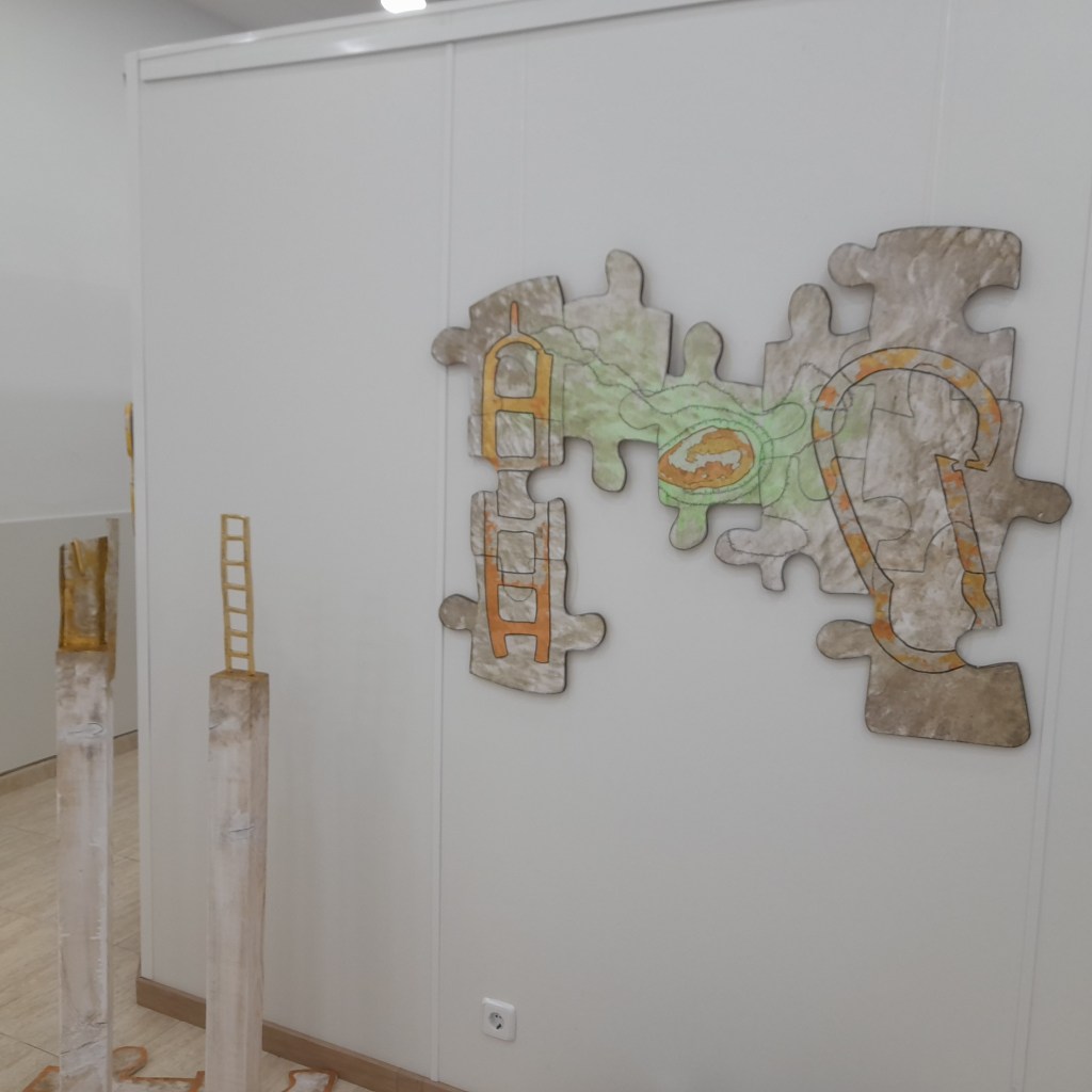 La Núria va seleccionar unes fotografies que ella mateixa havia tirat i va fer alguns textos recordant els anys d’infantesa junts amb la Mercè. I d’aquí aquesta, n’ha estirat el fil i han sortit les peces de fusta. Les obres que van penjades són peces de puzle que van encaixant la història. Tenen representats objectes que es relacionen amb els textos i també tenen manuscrits algunes de les frases de la Núria. Les fotografies i els textos de la Núria també es presenten dintre peces de puzle.