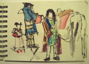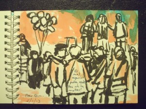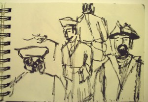 Aquests dibuixos recents volen plantejaments diferents als del Quadern de Zenda, on el moviment era més repetitiu, al ser una dansa amb una coreografia que s’anava allargant en el temps, durant uns quants compassos. D’alguna manera hi anava millor explicar-ho amb el traç de color i el suport posterior de la línia negra, per acabar de definir les formes. En els dibuixos de Tarzan i el d’aquest espectacle, els moviments són irrepetibles i aleshores és la línia el qui ho pot explicar. Per això ha anat bé introduir de nou el Pentel de tinta, perqué pot explicar millor el moviment de les danses de grups de goril·les i descriure la forma (veure últims dibuixos de l’Album “Entre lianes” publicat al flickr). Aquí presento el dibuix de Manresa, més avall trobareu l’accés a l’album de Tarzan, amb setze dibuixos nous (a 23 d’agost).