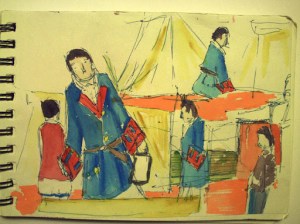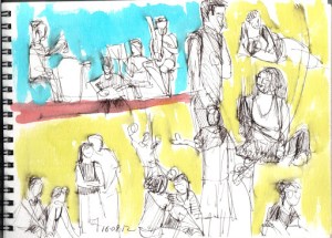 El dimecres 22 d’agost vaig assistir a la performance d’inauguració de l’exposició de Marina Berdalet i No Parfum a la sala de la Plana de l’Om, a Manresa. Com dimecres vinent podreu llegir a una nova entrada de la sèrie “Treballs d’estiu”, va ser un espectacle sublim, contundent. No em vaig poder estar de fer un dibuixet que beu molt dels apunts que he fet als assajos de Tarzan, a l’hora d’anar ràpid i explicar l’esdeveniment amb fragments d’imatges. No hi ha color, només línea. Tal i com són inicialment els dibuixos que he fet pel musical de Tarzan, on després hi afegeixo el color d’aquarel·la per separar i endulcir.