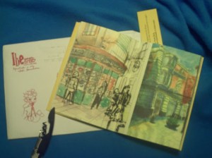 L:’origen de la sèrie està en la lectura d’un llibre en que parlava de les “bouquinistes” de París, que són parades de llibres de vell situades als passeigs del Sena. Em vaig imaginar l’emoció del comprador descobrint un llibre. Però d’aquí vaig cercar a una visió més localista del tema i vaig pensar amb les parades de llibres de la diada de Sant Jordi. El tema no és el mateix i potser tornaré en el tema original en una altra ocasió. Si fas el tema dels llibres de Sant Jordi em va semblar natural completar-lo amb una altra estampa dedicada a les roses i una tercera amb el moment de donar-se els regals entre enamorats. Em va semblar que per una mostra internacional seria xulo parlar de tradicions catalanes tant maques.