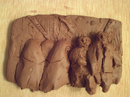 Des de l’inici de les classes de ceràmica, he començat a fer alguns relleus de petit format amb fang. Els primers, molt petits, eren per fer segells. Més endavant n’he fet d’una mica més gran amb un tema de caire narratiu: vaig començar amb un apleg al Turó, contribució al tema de la nit que tots els alumnes preparem per l’exposició de final de curs. Els dos últims relleus són de caire més crític: la contaminació del medi i la discriminació. Us mostro la imatge d’aquest darrer, just acabat amb el fang tou, sense coure. Tampoc se si han d’anar pintats. M’agrada el to natural del fang. I sobretot és un material molt amable per expressar-se.