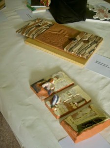 El divendres 1 de juliol s’inaugurava l’exposició de final de curs amb els companys de ceràmica i també els de pintura de l’Escola de Perones Adultes de Centelles. El Niu del Palau acull la mostra amb peces dedicades al tema donat de la lectura. Com a investigació, durant el curs, he estampat planxes de linòleum sobre fang, que després acaben “pintats” amb òxids i esmaltats. Per la meva peça de la lectura he repetit aquest exercici.