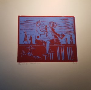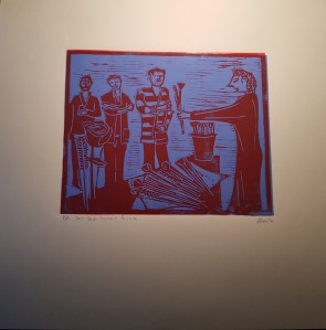 Per tancar el cercle i donat que una imatge tant pot servir per fer una pintura o un gravat; per accentuar la solidaritat, encara vaig preparar una planxa de linòleum amb la mateixa composició, de la qual n’he tirat deu còpies i cinc proves d’artista. Les deu estampes numerades també formen part del material de la tómbola. La sèrie estampada està tirada amb tinta negra sobre paper blanc.